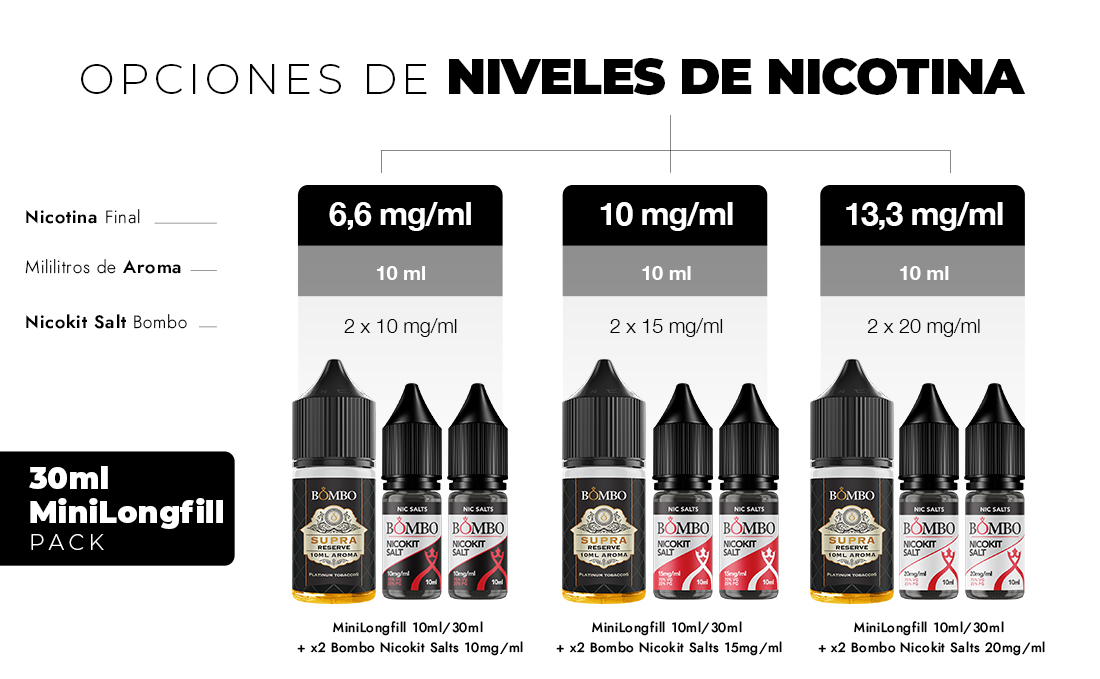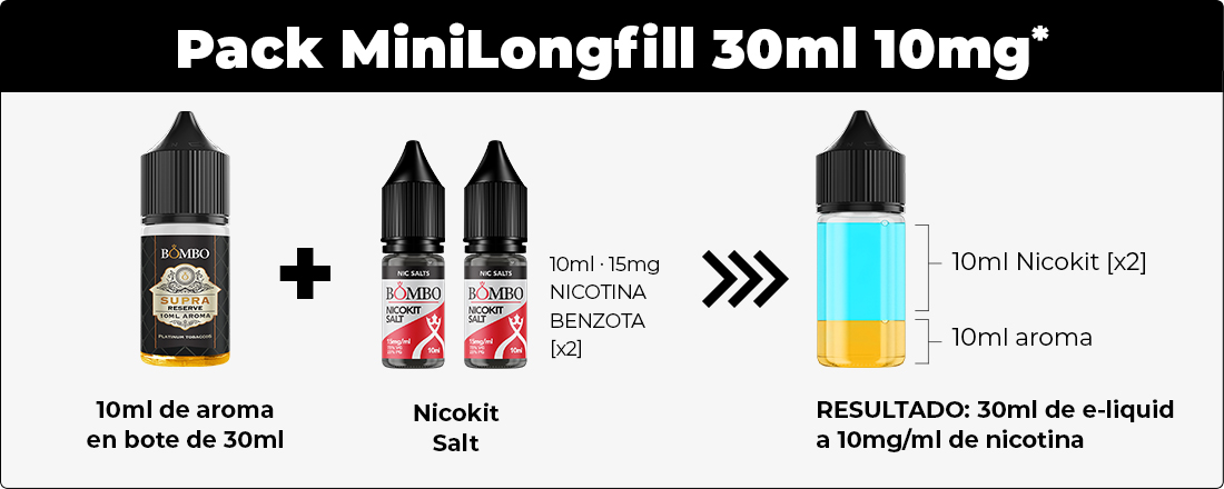 Los Aromas Minilongfill de Bombo en formato 10ml en botella de 30ml, están disponibles en todas las gamas de Bombo y han sido especialmente diseñados para la preparación de Nic Salts.