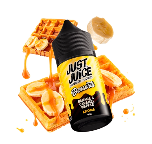 Just Juice Desserts Banana Caramel Waffle Aroma Longfill 6ml, un e-liquid concentrado que fusiona el sabor de un gofre dorado y crujiente cubierto de cremoso caramelo y la dulzura natural del plátano maduro. Un aroma goloso, cálido y envolvente perfecto para los amantes de los postres intensos.