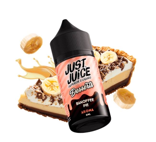 Just Juice Desserts Banoffee Pie Aroma Longfill 6ml. Disfruta de una mezcla irresistible donde los plátanos maduros, con una base crujiente de galleta y el dulce de leche cremoso se fusionan con una nube de nata montada y un toque de chocolate. Un aroma profundo, goloso y equilibrado, ideal para quienes buscan un sabor repostero auténtico y envolvente.