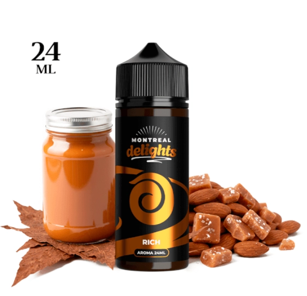 Montreal Delights Rich destaca por su intenso perfil de dulce de leche, suavizado con caramelo ligeramente saladoalmendras y un característico toque de tabaco que aporta profundidad y equilibrio. Las técnicas de ósmosis inversa de Montreal Original garantizan un tabaco limpio, realista y de gran persistencia.